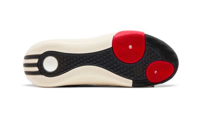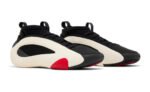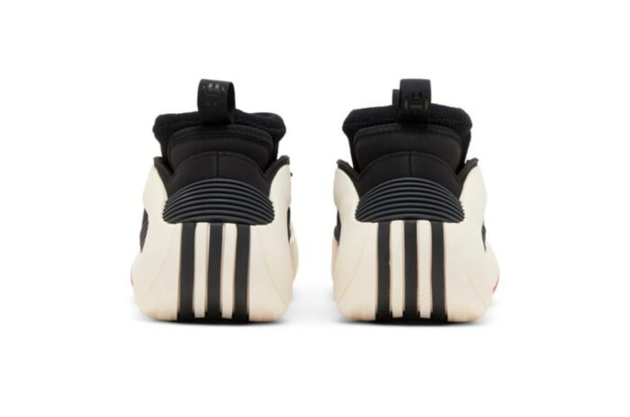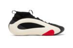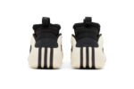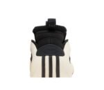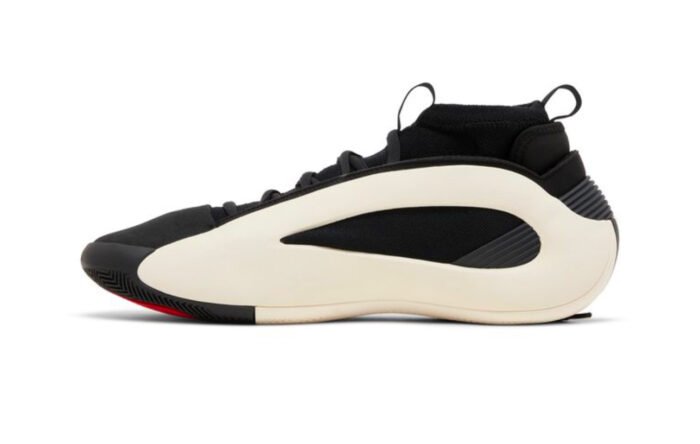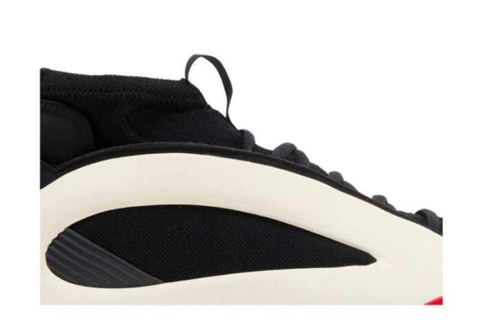 This performance basketball shoe features a supportive EVA frame that looks like an off-white teardrop. It provides structure around the sock-like inner cuff, which allows the cuff to fit securely from toe to ankle. The EVA frame wraps around the arch and extends into a Boost midsole in the same Cloud White hue. The upper is made of black textile that wraps around the foot, while a panel of black leather wraps around the toe area. There are no branding details on the upper, which contributes to the sneaker’s futuristic aesthetic.