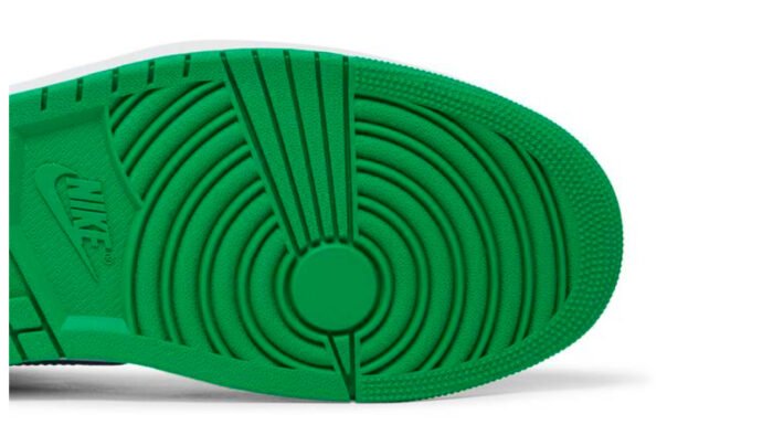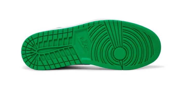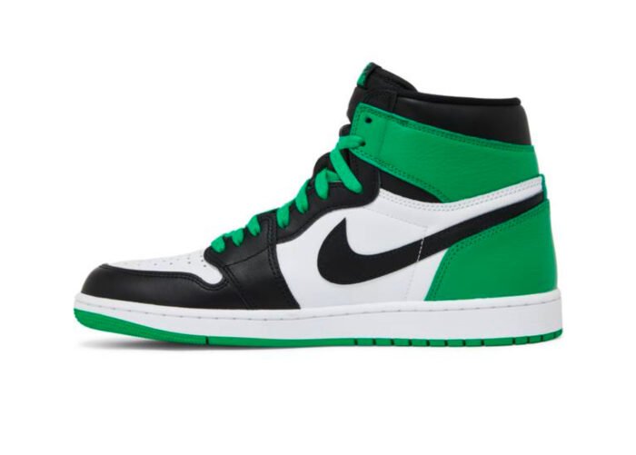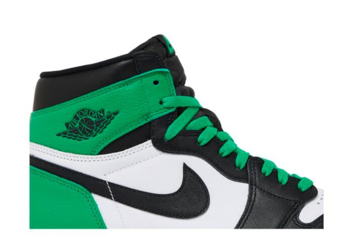 The Air Jordan 1 Retro High OG is constructed using a leather upper, brought to life with shades of white, black and Lucky Green throughout. Lucky Green Nike branding sits on top of the black tongue and insoles of the sneaker. The sneakers are tied together with Lucky Green laces.