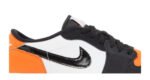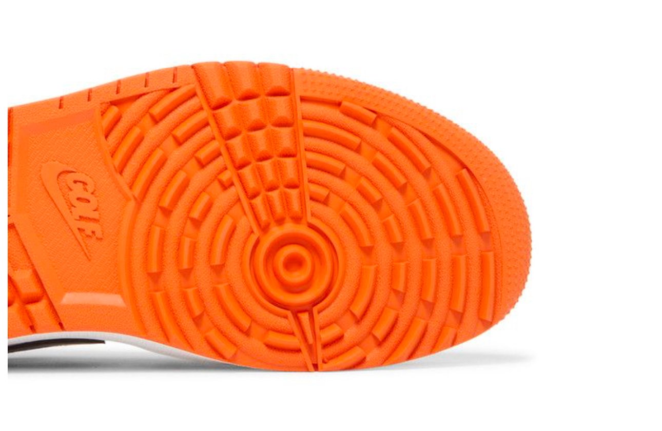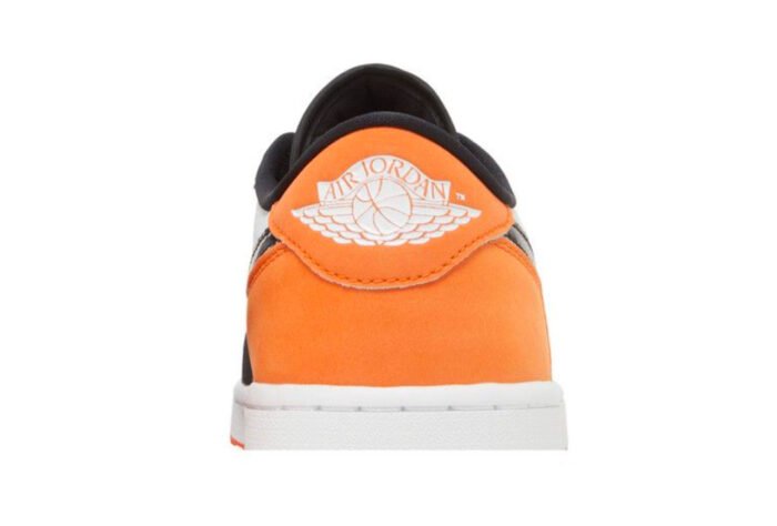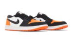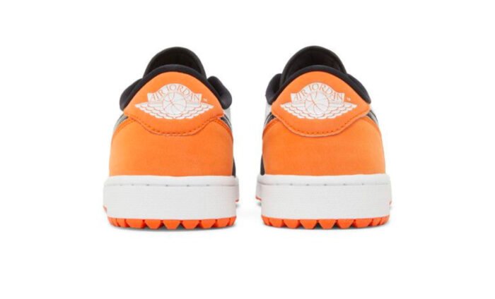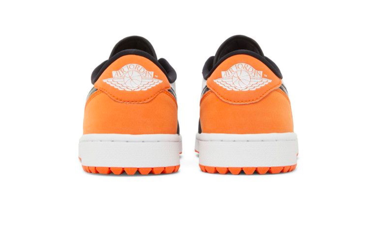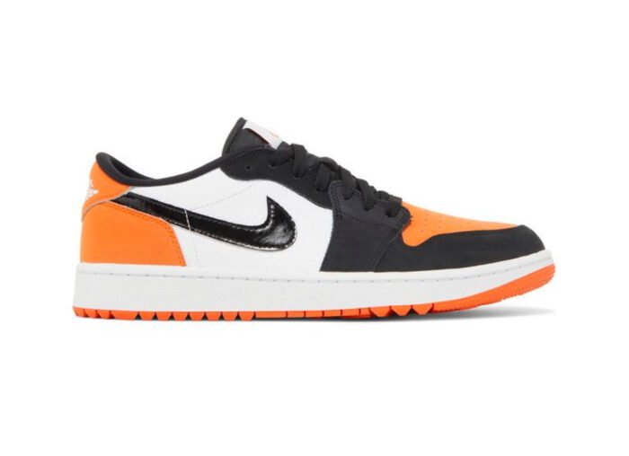 The Air Jordan 1 Low Golf Shattered Backboard features Sail tumbled leather panels, black overlays, and matching nylon tongue, lining, and laces. The shoe has an air midsole cushioning. It features a tangerine shade over the perforated toe, heel, and ankle. It also has nubuck overlays in an inky tone with a contrasting white pebbled leather side panel.
