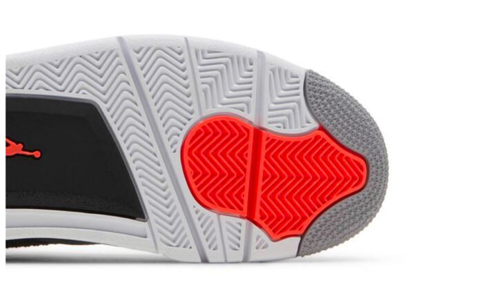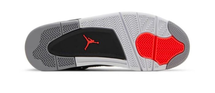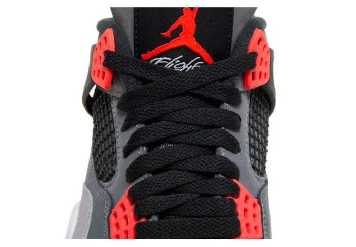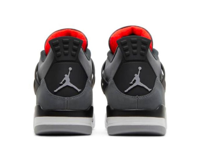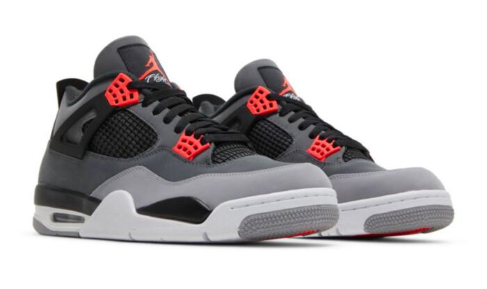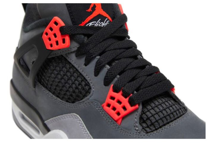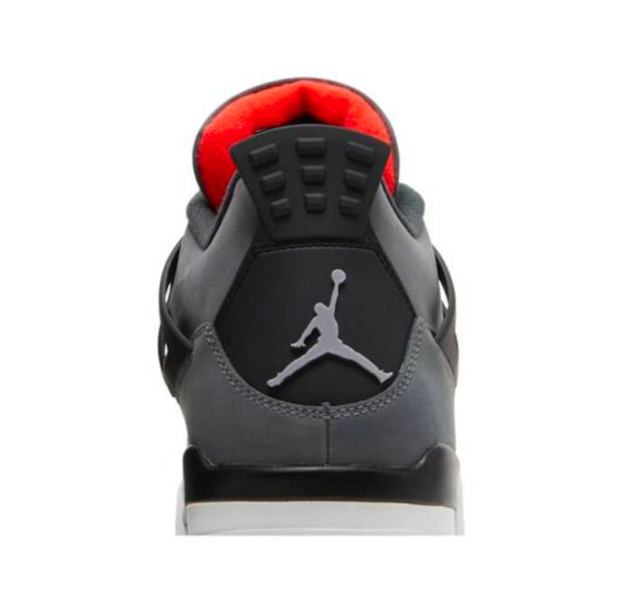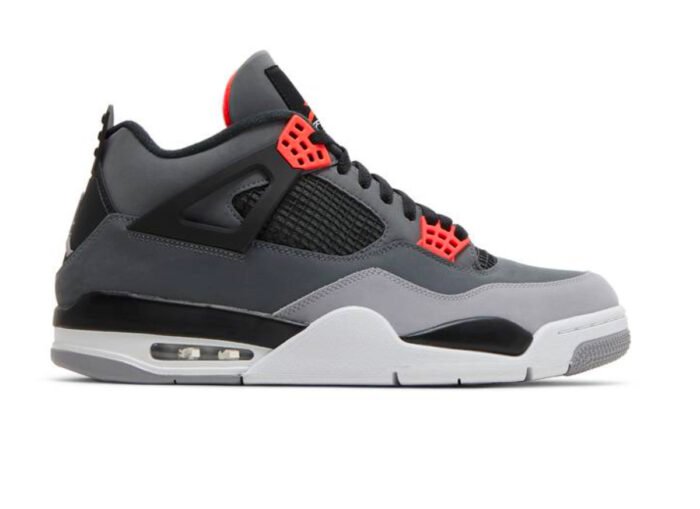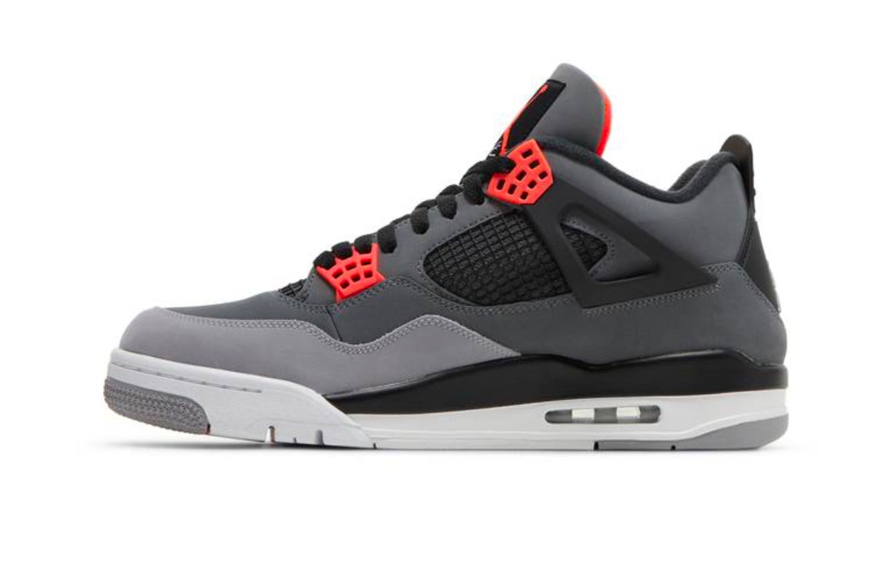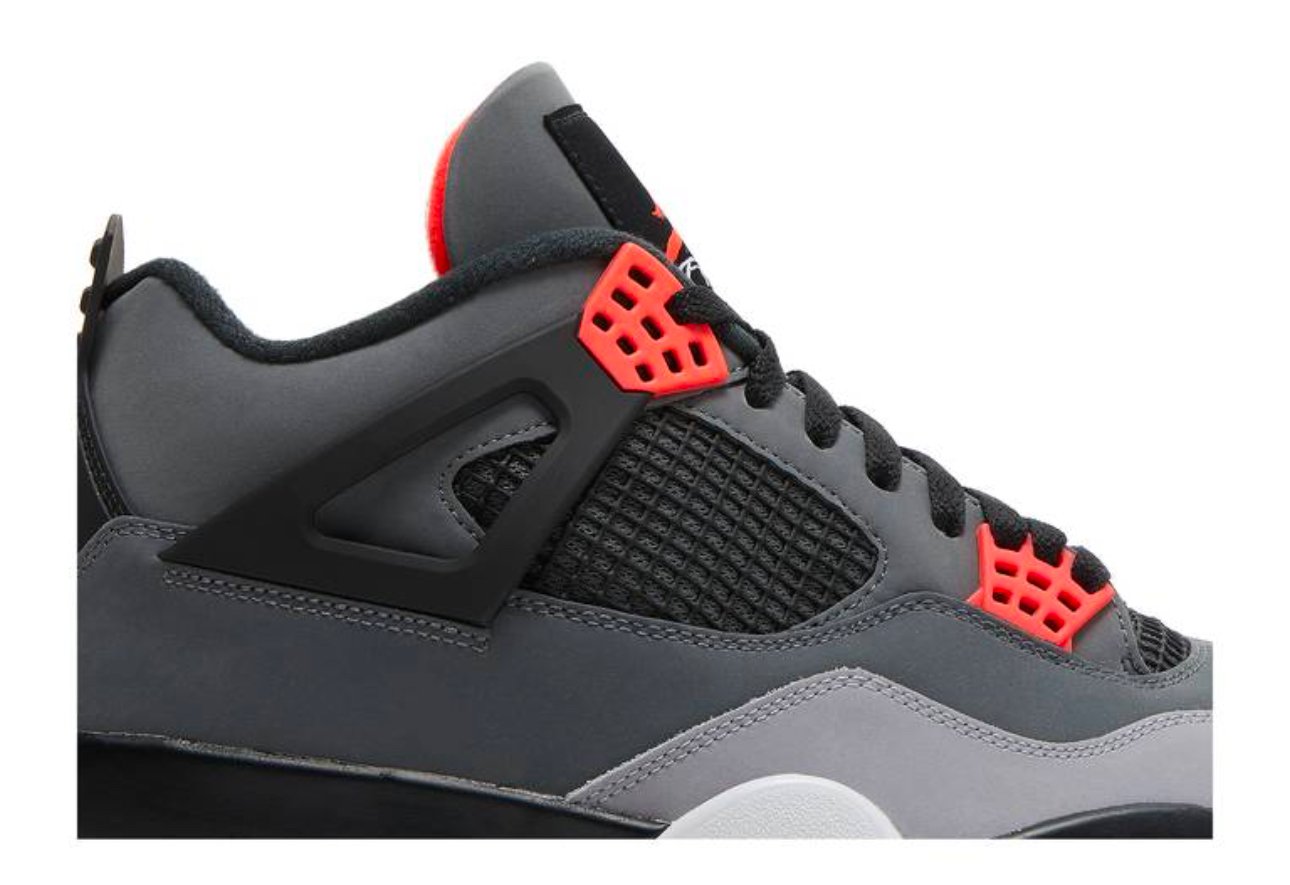 The Air Jordan 4 Infrared features a tonal grey Durabuck upper with black TPU mesh inserts, tech straps, and heel tabs. Hits of Infrared on the lacing system and woven Jordan Flight tongue label add a sharp contrast to the neutral-toned base. From there, a white sole with visible Air units completes the design.