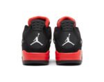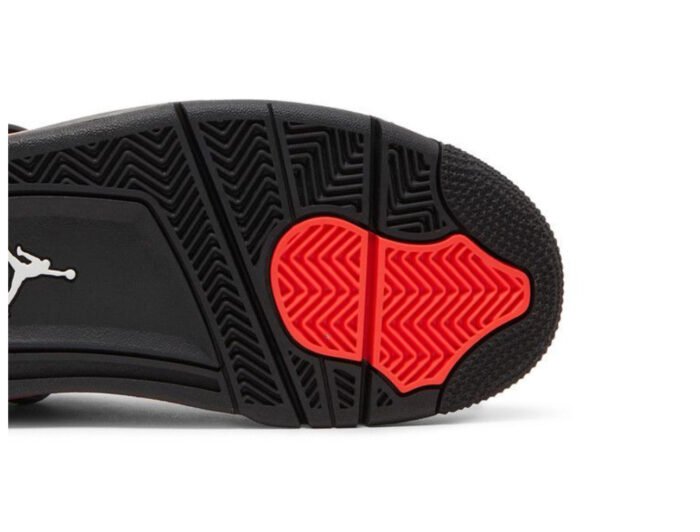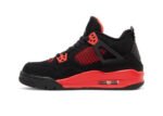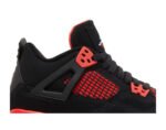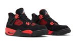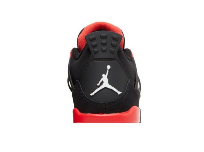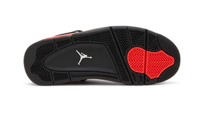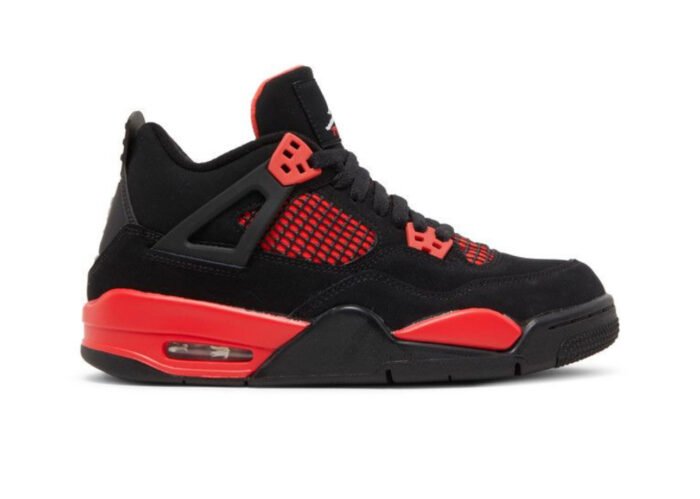 The grade school-sized (GS) Air Jordan 4 Retro Red Thunder GS uses a Black/Crimson/White colorway that features a white Jumpman on the black heel, tongue, insole, and outsole. The upper of black nubuck is accented with red mesh on the toe box, quarter, and inner tongue. Other features of the Air Jordan 4 Retro Red Thunder GS include red waffle eyestays and a black plastic heel tab. The red midsole features a visible Air compartment. On the black rubber outsole, the iconic star pattern arches over an area of red rubber chevrons.