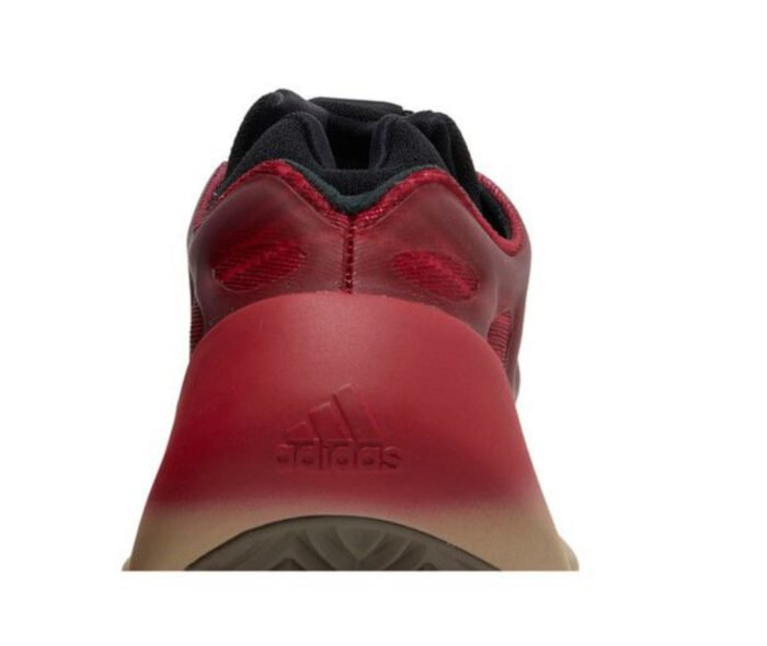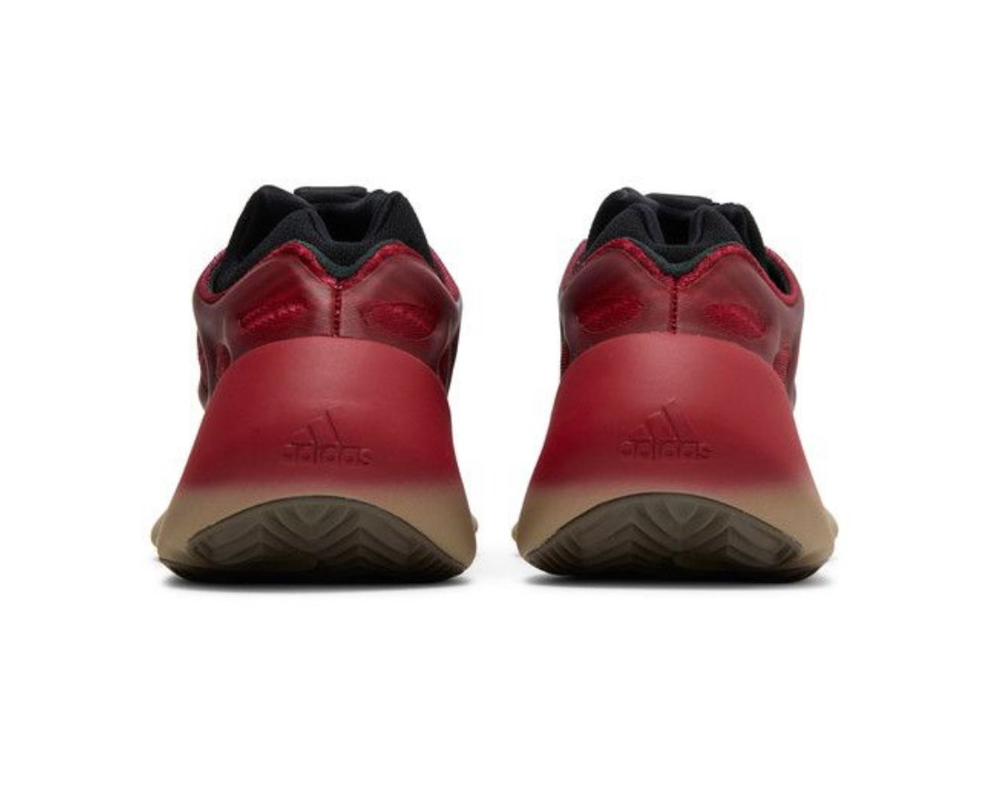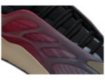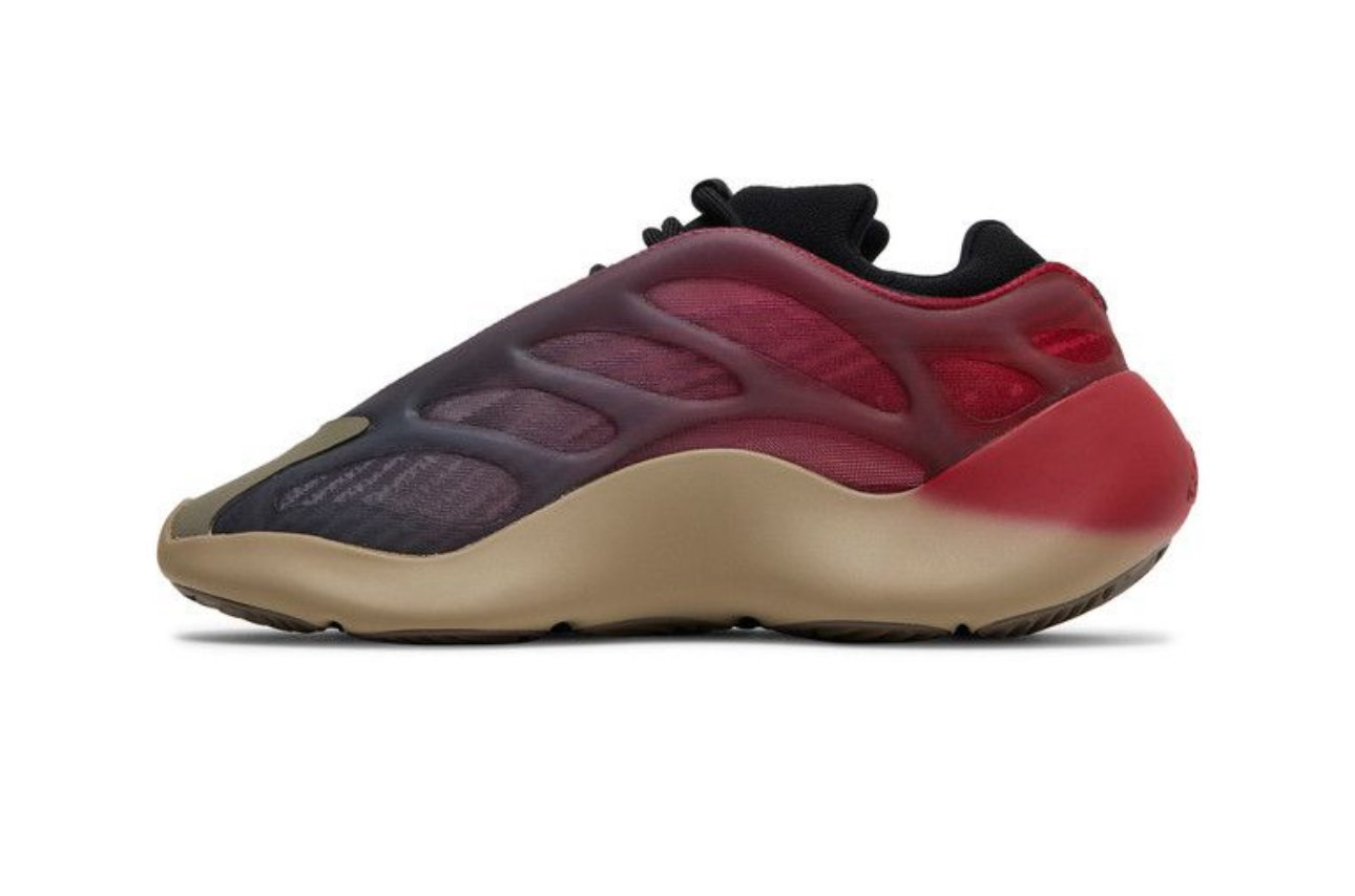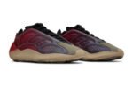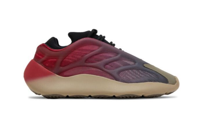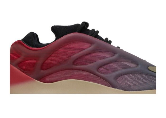 The adidas Yeezy 700 V3 Fade Carbon features a red-to-purple gradient Primeknit upper with semi-translucent TPU lace cage unit and light grey reinforced toe wrap. The gradient theme continues on the EVA foam sole, where red on the heel transitions into a light grey. A black mesh collar and lace system completes the design.